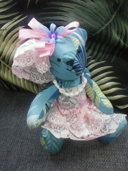 倉庫の整理をしてたら、昔試作品として作った”アロハベア”が(@_@) 娘が欲しいと言うのであげたら、今度は”ドレス作って"......。レースを入荷したので、まぁ作ろうと、ドレスを作ると"お耳に、飾りつけたい".....