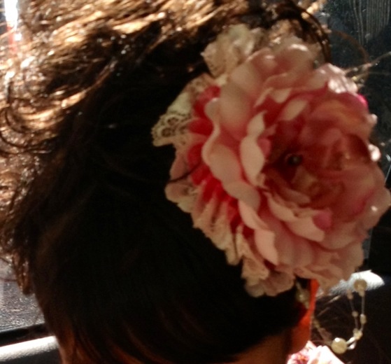 衣装にあわせて、ポイントになるように、大きな花をリボンレイの手法とコラボして作りましたo(^▽^)o